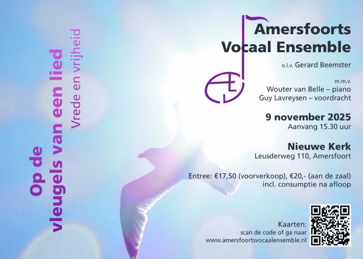 Dit jaar herdenken we dat 80 jaar geleden een einde kwam aan de Tweede Wereldoorlog. Wereldwijde vrede lijkt echter verder weg dan ooit. Met het concert Op de vleugels van een lied wil het Amersfoorts Vocaal Ensemble een artistiek en aansprekend moment van bezinning creëren, dat niet alleen schoonheid en troost biedt, maar ook uitnodigt tot reflectie.