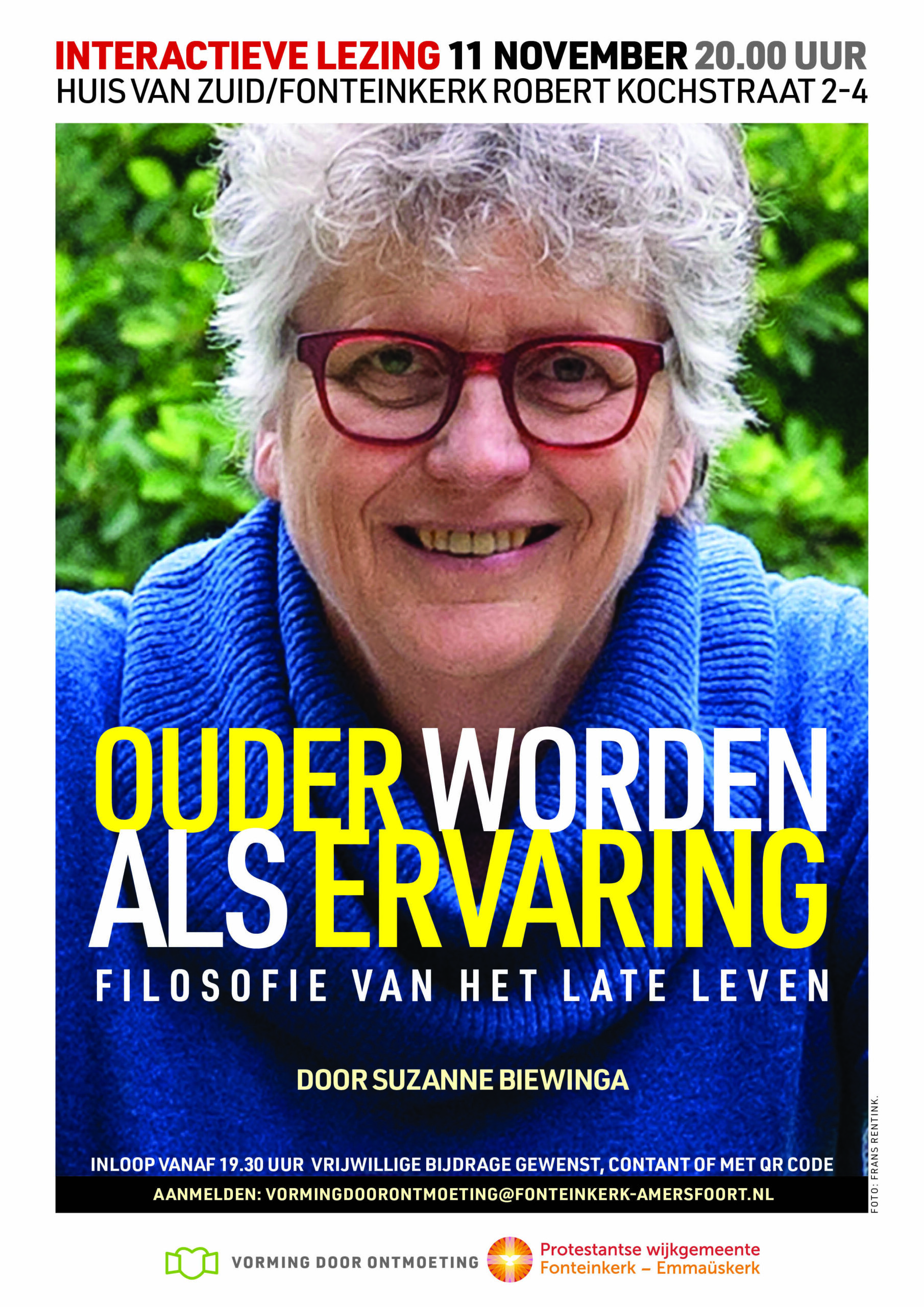 Suzanne Biewinga promoveerde begin dit jaar als 70-jarige aan de Universiteit van Amsterdam Ze promoveerde op dit vernieuwende onderzoek en schreef er een boek over, Ouder worden als ervaring, filosofie van het late leven. In haar lezing stelt zij een nieuwe manier voor van denken en spreken over ouder worden. Een manier die aansluit bij de ervaringen van ouderen zelf, zodat het late leven in al zijn veelzijdigheid een waarachtige betekenis krijgt. Vrij van clichés en vooroordelen.
