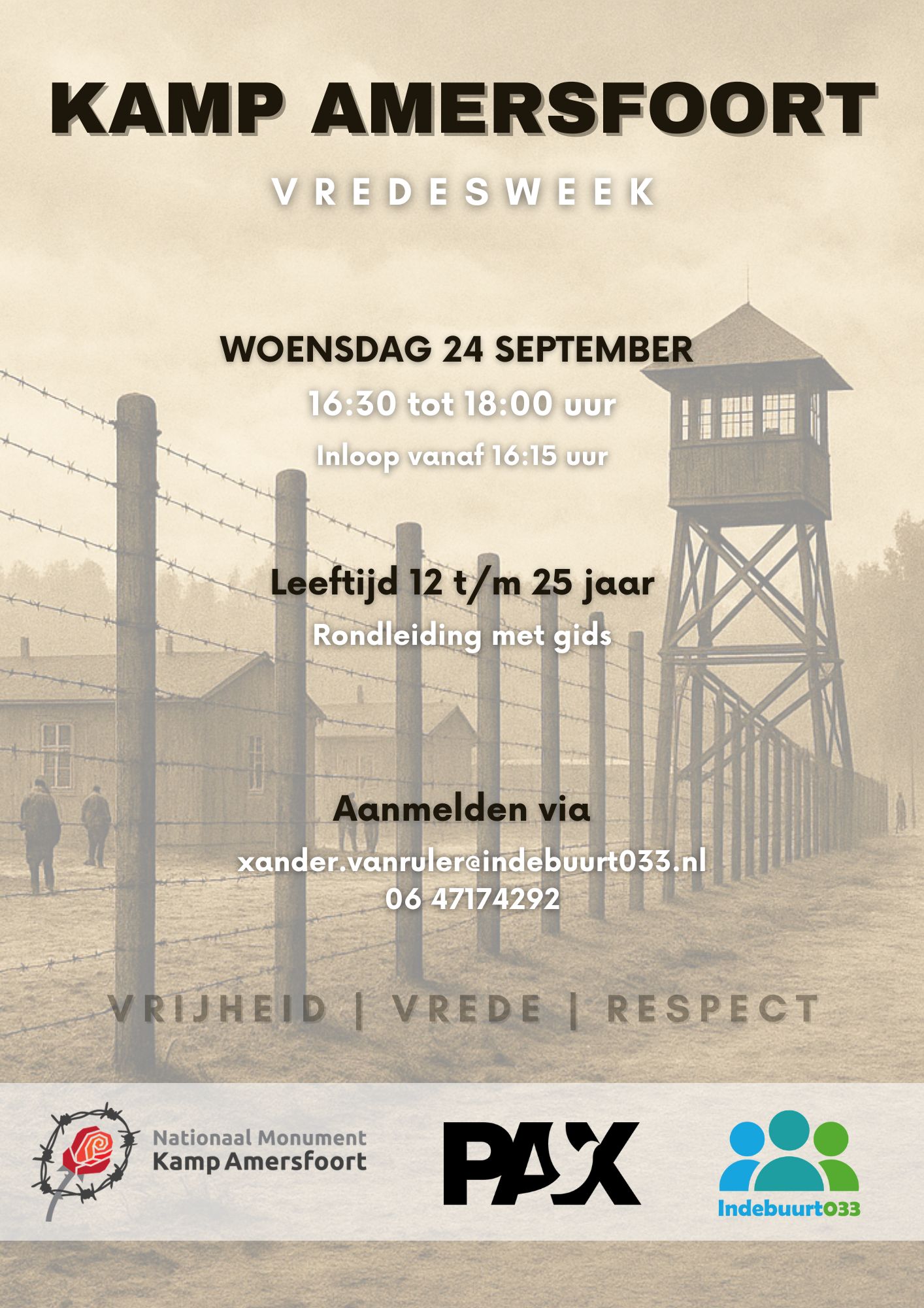 Deze bijzondere activiteit is het resultaat van een mooie samenwerking tussen de Vredesweek, Nationaal Monument Kamp Amersfoort en het jongerenwerk van Indebuurt033 Amersfoort. Dankzij deze samenwerking wordt geschiedenis op een toegankelijke en betekenisvolle manier tot leven gebracht voor de jonge generatie. Aanmelden voor 20 september.