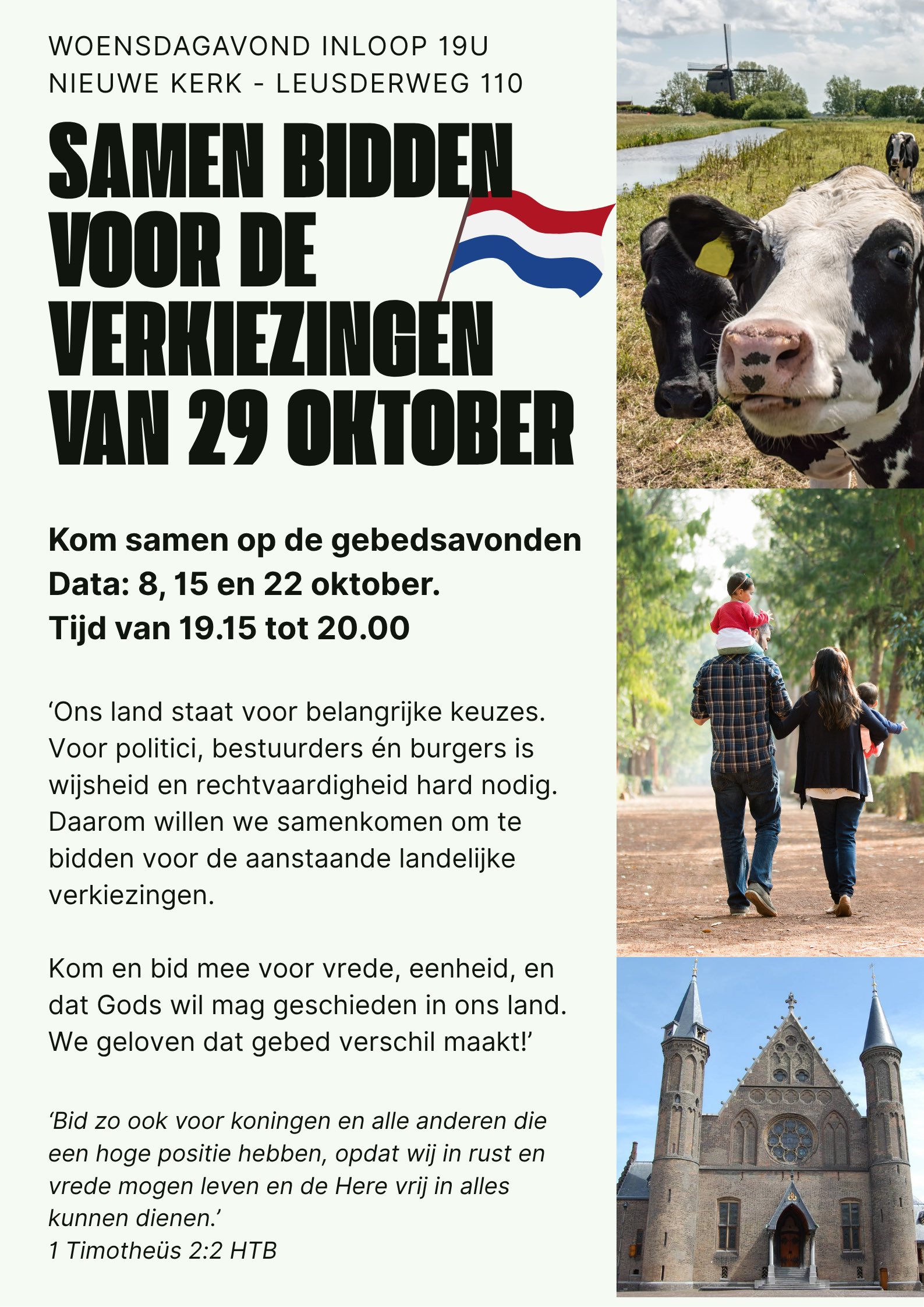 Ons land staat voor belangrijke keuzes. Voor politici, bestuurders én burgers is wijsheid en rechtvaardigheid hard nodig. Daarom willen we samenkomen om te bidden voor de aanstaande landelijke verkiezingen.