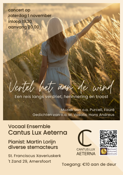 Het vocaal ensemble Cantus Lux Aeterna treedt op samen met pianist Martin Lorijn en verschillende stemacteurs. Naast muziek van o.a. Purcell en Fauré klinken er gedichten van M. Vasalis en Hans Andreus.